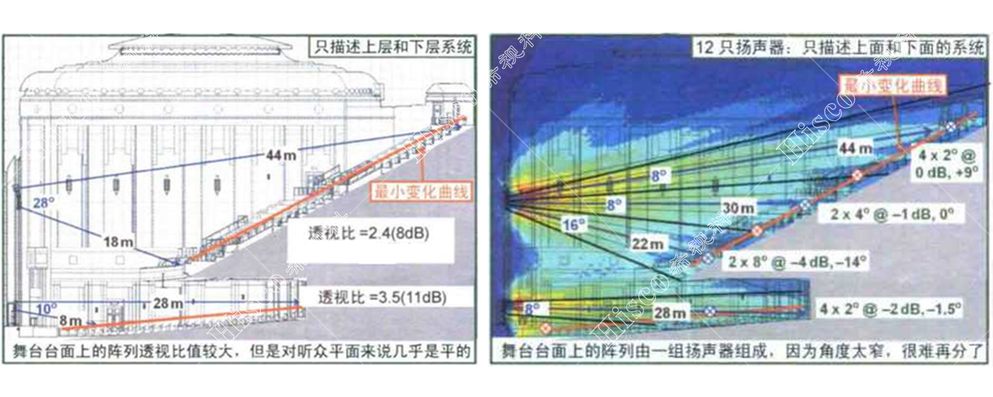 音乐厅是要以传达自然声的主要声源,是直达声能覆盖全场的关键。在音乐厅的设计上,我们尽可能少的布置音源,把音源集中在舞台上,这样出来的声波没有干涉,声音更纯净,频率响应在所有的扩声区域保持更好的一致性,能较好地实现了声波投射中的覆盖角的控制,减少了声散射和漫射带来的反馈和无规声干涉及声能量的损失,相对提高了有效的声压级的覆盖,提高扩声增益。